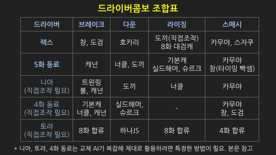 좋은 드라이버 콤보 요원의 배치는 아래 표를 참고하면 된다