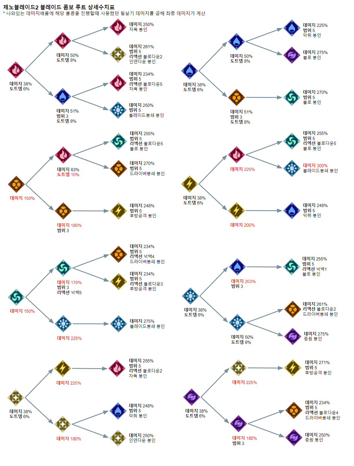*특정 블콤 루트는 도트뎀이나 작은 범위 등이 달려있거나, 1, 2 단계 블콤 데미지 배율이 다른 루트에 비해 유독 세거나 하는 경우가 있기는 하다.