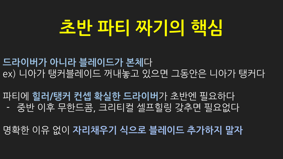 - 니아를 빼고 메인힐러 없이 서브힐러 블레이드 여러명을 여러 드라이버에 나눠 달아줄 수도 있다