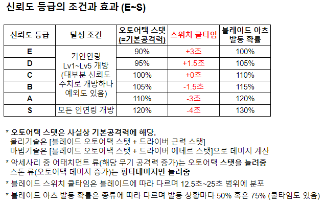 블레이드별 기본 스위치 쿨타임 수치를 정리하면 이렇다 (신뢰도 C등급 상태 기준)