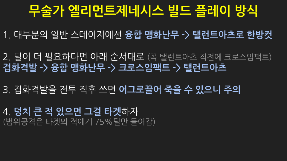 범위 공격화(평타범위 12m 평타딜 +60%): 평타딜 파티에서는 가장 중요한 엠블렘. 아니면 별로다