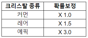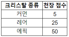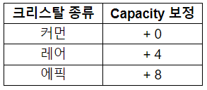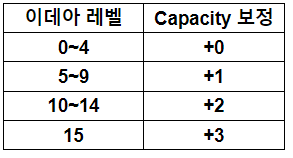 - 커먼 코어 크리스탈과 이데아 레벨(가장 높은 이데아 or 부스터 사용한 이데아)에 따른 Capacity 보정은 다음과 같다