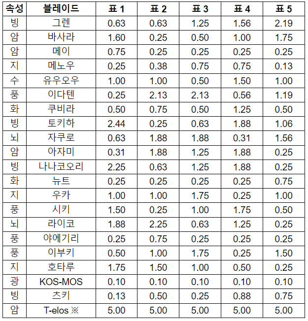 ㄴ 왜 속성간에 차이가 나냐면, 야에기리, 라이코, 지카라오 때문에 풍/뇌/지속성의 힘 필드스킬은 다른 속성과 달리 최대 5렙까지 존재하는데, 커먼 블레이드는 실제로 최대 필드스킬이 3렙까지밖에 없다고 하더라도 저 사실 때문에 확률 계산이 영향을 받아서 그렇다고 함. 결론은 개발자의 실수.