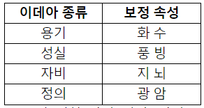 1. 용기, 성실, 자비, 정의 4가지 중 하나의 이데아만 확률 보정에 선택됨