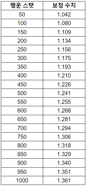행운 스탯으로도 확률 보정이 일어나는데, 계산식은 다음과 같다