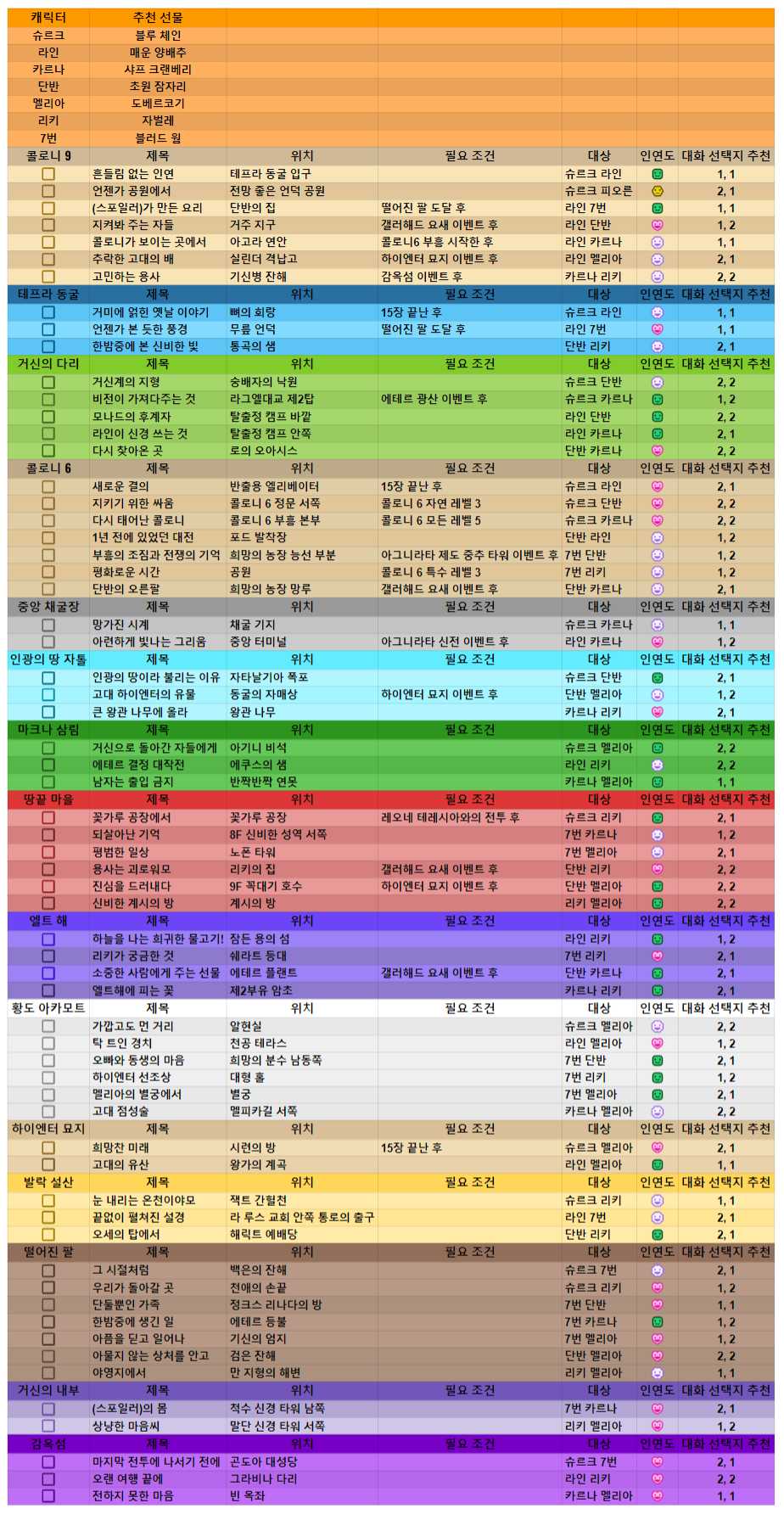각 캐릭터 추천선물 스폰위치 및 획득처