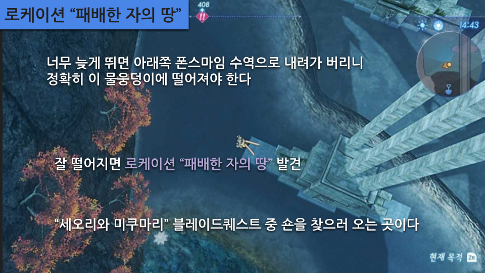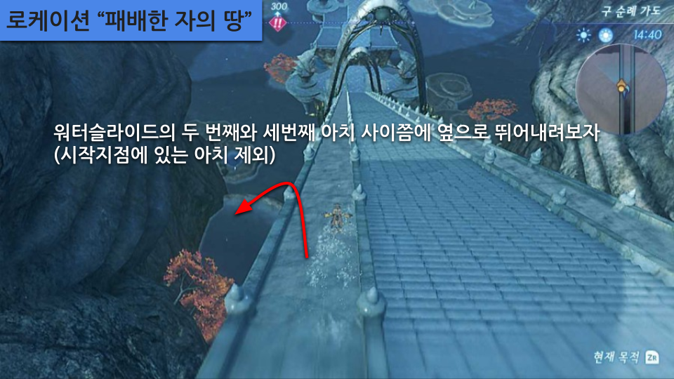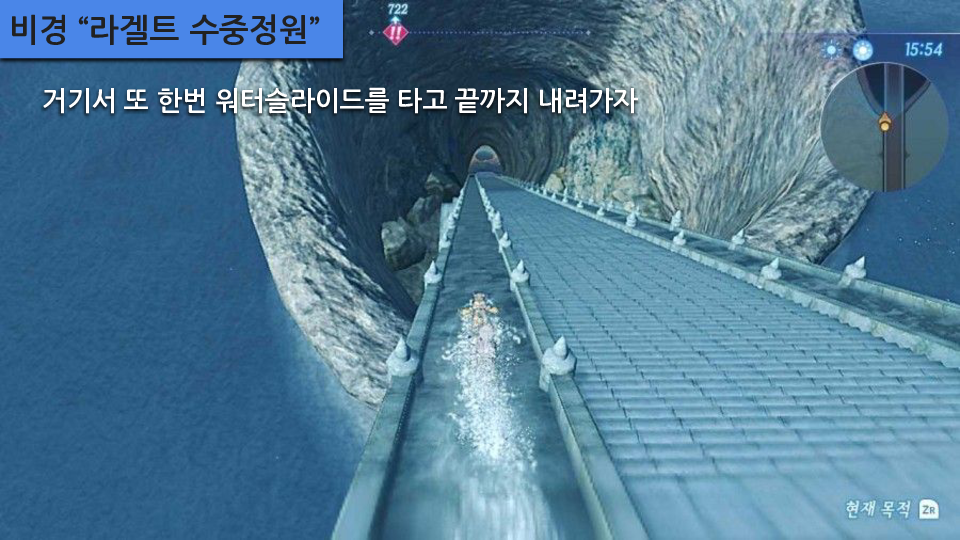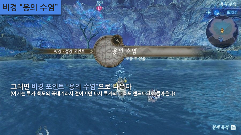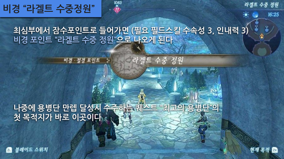 주요 장소: 메인스토리 수문 열기, 루자의 대폭포, 용의 위장 (관련퀘- 아르스 연구자, 콜의 병), 비경 "용의 수염", 죄인의 바위동굴 (관련퀘- 행방불명이 된 노폰), 페를라 분수공원 옛터 (관련퀘- 무스비 블레이드퀘), 비경 "라겔트 수중정원"