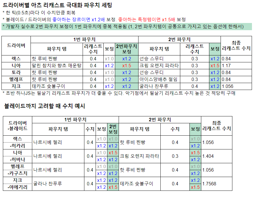 파우치아이템 중에서는 디저트 쪽이 보통 아츠 리캐스트를 올려주니, 수치가 0.3~0.4인 것들을 찾아서 사먹이면 된다