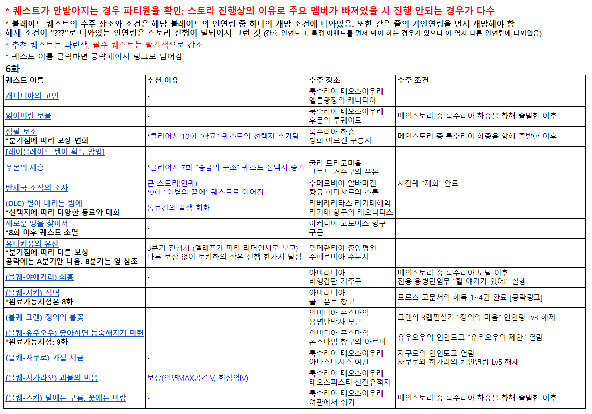 # 6화 퀘스트 목록. 제목링크 탈 수 있는 원글은 [이 페이지]를 참고