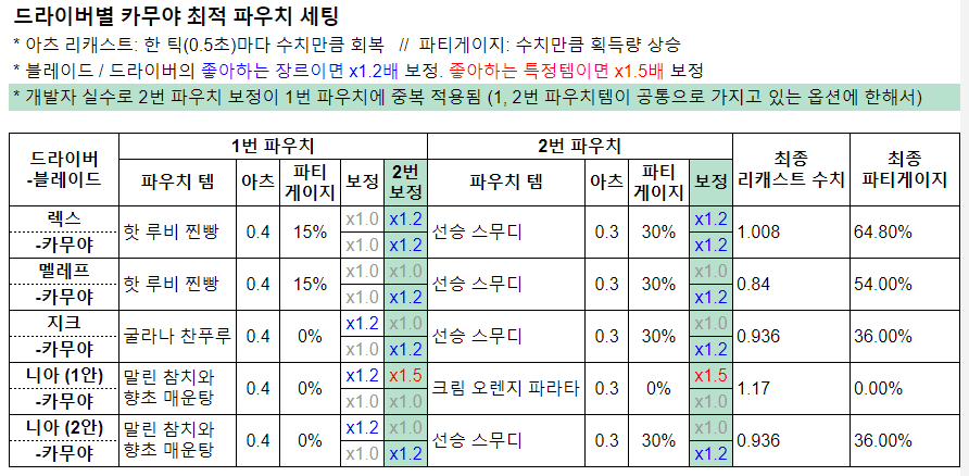 - 쿨감 세팅이 없으면 한 사이클이 너무 느리게 돌며 블콤 맞추기도 쉽지가 않아 제대로 써먹기 어렵다