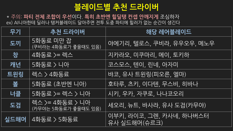 아래는 2회차 전용 블레이드들에게 어울리는 드라이버를 적었다. 이 블레이드들은 스토리 중 주요 등장인물이기 때문에 스포일러라서 접은 글로 해놓았다